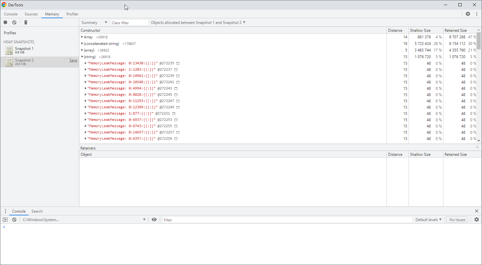 npm initnpm install mustache@4.2.0index.jsnode --inspect index.js.chrome://inspect/inspectlinkMemorytabTake heap snapshoticon once a minute.ACTUAL RESULT: