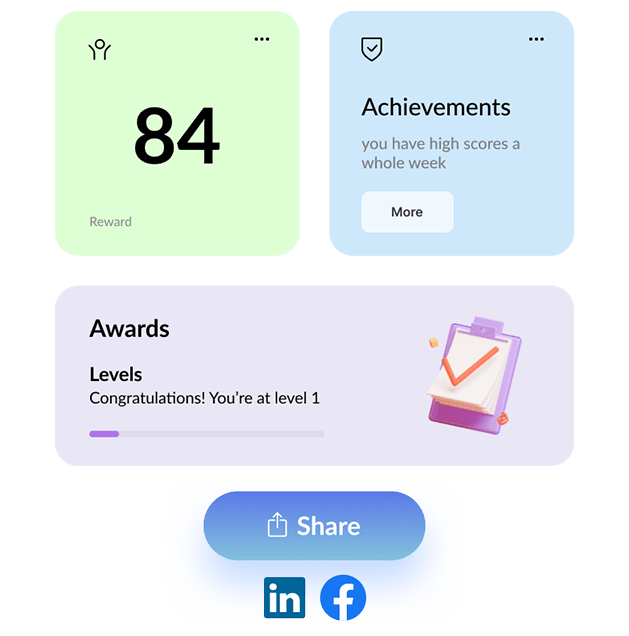 Employees receive rewards and badges for “fastest completion of training”, “highest score during training”, “top 5 best results,” and so on. Accumulating achievements leads to receiving gifts after reaching a certain threshold.