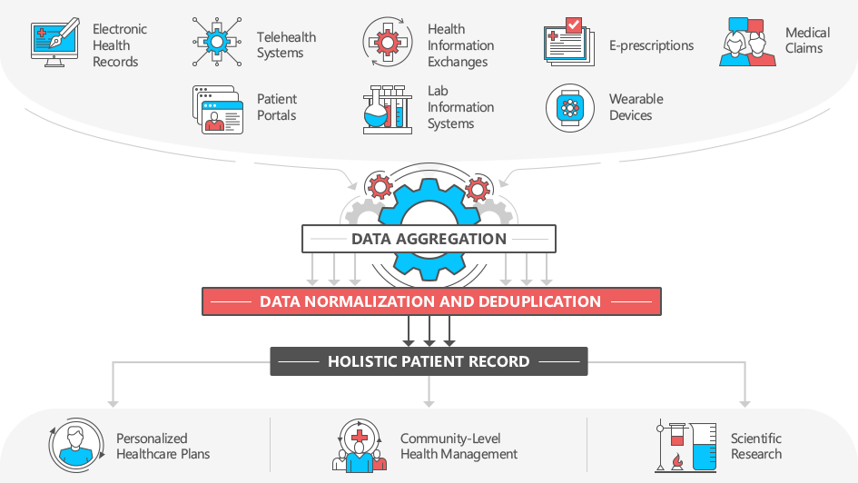 Next comes the process of data normalization that brings all the various formats and codes to a common denominator. Rigorous filtering helps eliminate duplicate records that are often created when a patient is logged into many disparate systems.