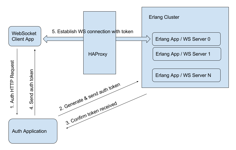 This is our basic flow which was modified slightly. We added a simple module to our Erlang application to track the number of websocket connections on each Erlang node. Due to “distributed” nature of Erlang, each node knows about other nodes connections.