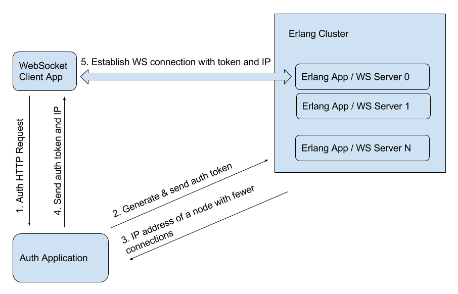 This is our basic flow which was modified slightly. We added a simple module to our Erlang application to track the number of websocket connections on each Erlang node. Due to “distributed” nature of Erlang, each node knows about other nodes connections.